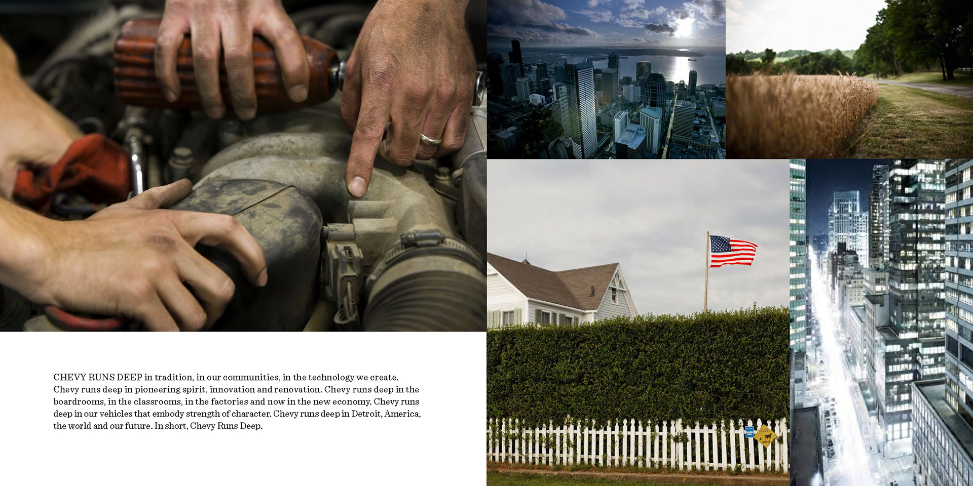CHEVY RUNS DEEP Way more than a manifesto, we created a book bound in an acrylic, laser-cut cover to capture the essence of the Chevy Runs Deep campaign. It was sent to the entire dealer network, CXOs, partner agencies and the media.